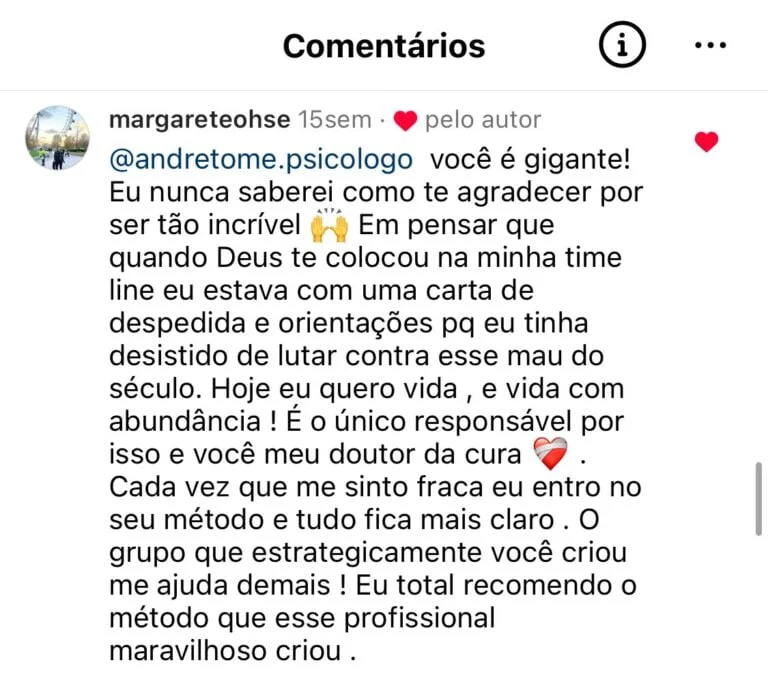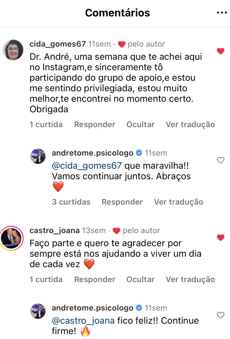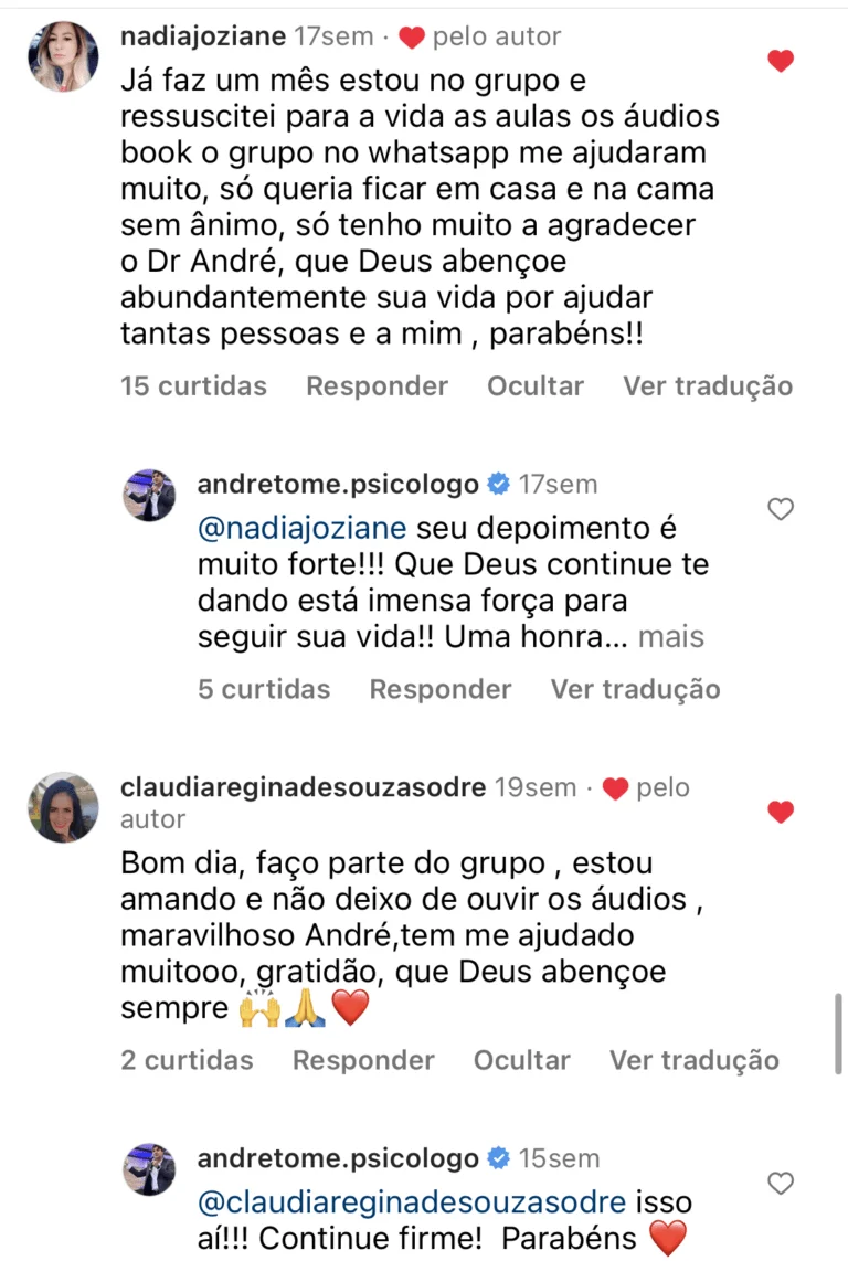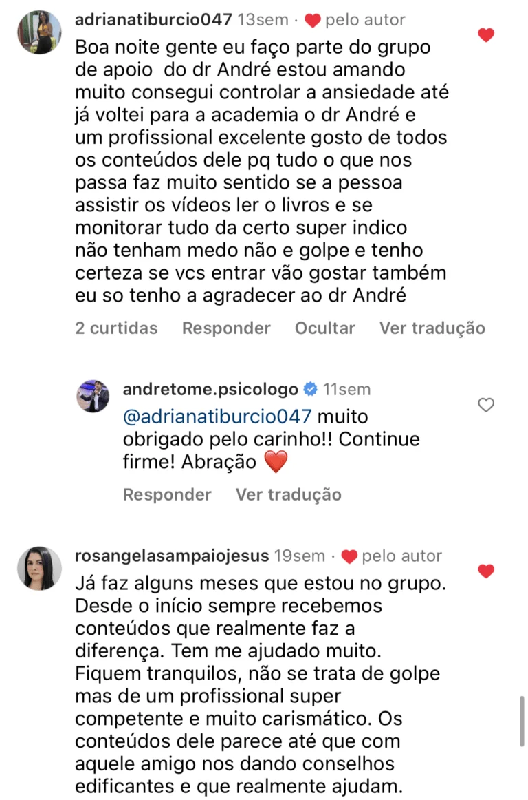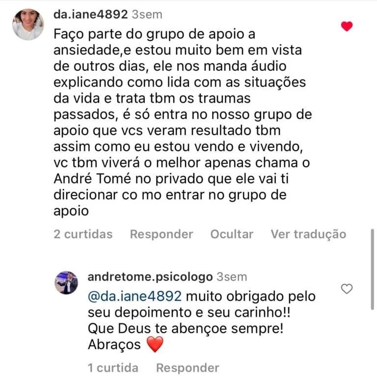 André Tomé, especialista em psicologia com 20 anos de experiência. Criador da maior comunidade de apoio a pessoas com ansiedade do Brasil, ja ajudei mais de 22 mil alunos a superarem seus complexos emocionais e a viverem de forma plena e equilibrada.